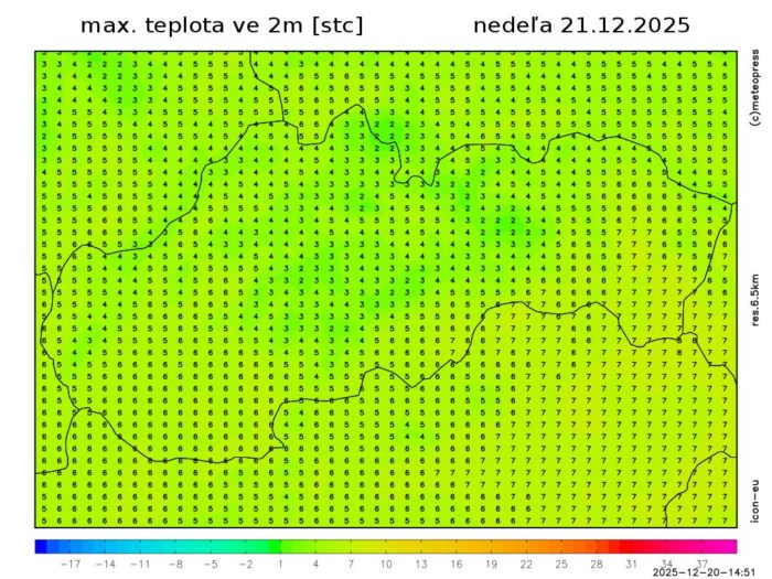 Obr. 4: Predpokladaná maximálna teplota vzduchu v nedeľu (21. 12.) podľa modelu ICON-EU
