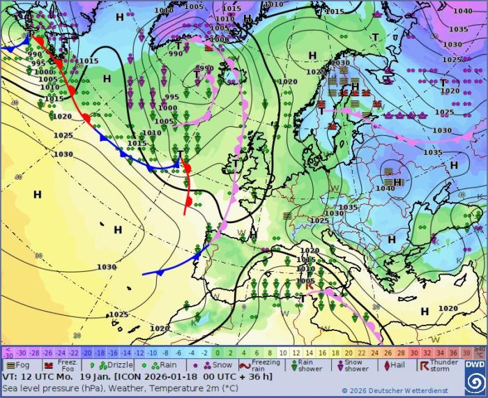 Obr. 1: Synoptická situácia – pondelok (19. 1.)