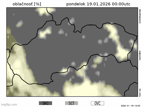 Obr. 2: Predpokladaný vývoj oblačnosti na Slovensku v pondelok (19. 1.) podľa modelu ICON-EU