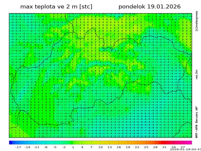 Obr. 3: Predpokladaná maximálna teplota vzduchu v pondelok (19. 1.) podľa modelu WRF