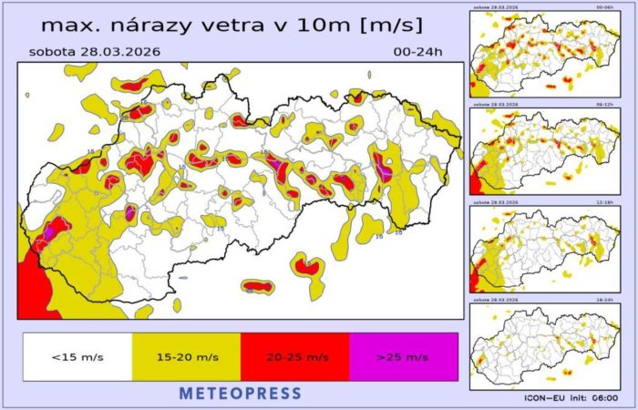 Obr. 3: Predpoveď maximálnych nárazov vetra v 10 m na sobotu, 28. marca, podľa modelu ICON.