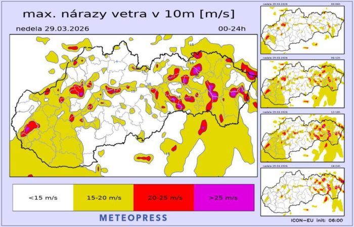 Obr. 4: Predpoveď maximálnych nárazov vetra v 10 m na nedeľu, 29. marca, podľa modelu ICON.