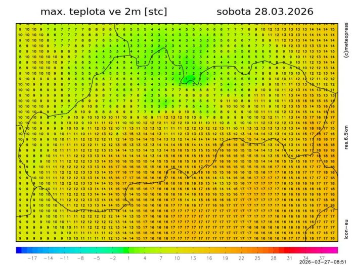 Obr. 5: Predpoveď maximálnej dennej teploty v 2 m na sobotu, 28. marca, podľa modelu ICON.