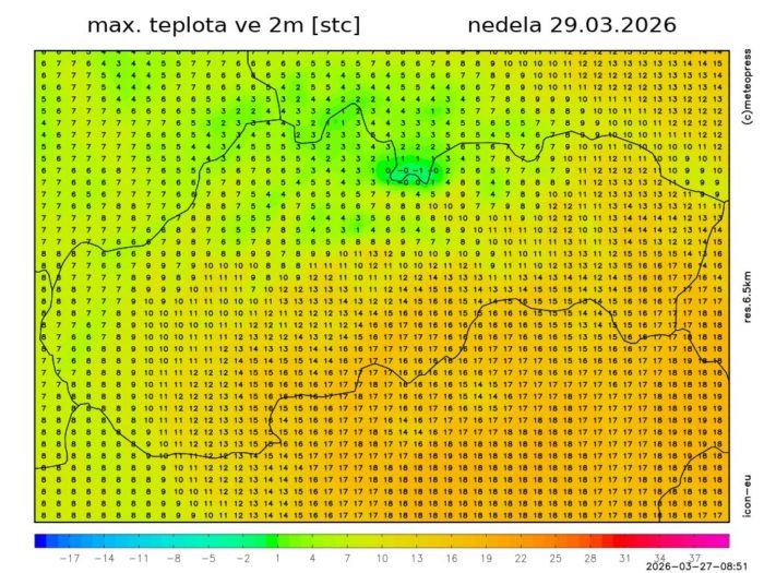 Obr. 6: Predpoveď maximálnej dennej teploty v 2 m na nedeľu, 29. marca, podľa modelu ICON.