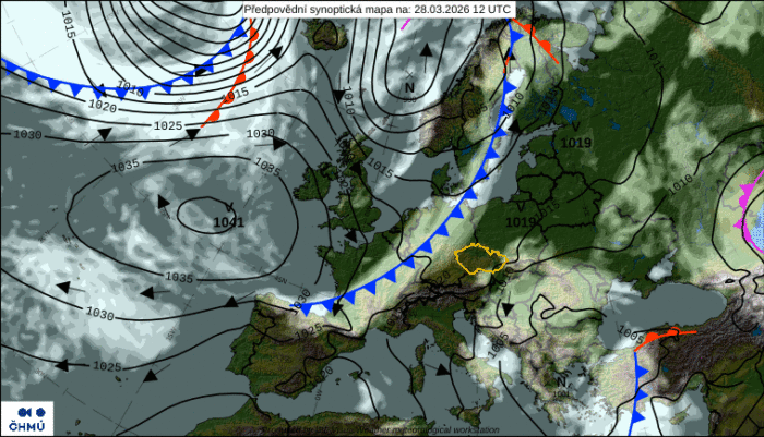 Obr. 1: Predpoveď synoptickej situácie na sobotu, 28. marca. Zdroj: ČHMÚ