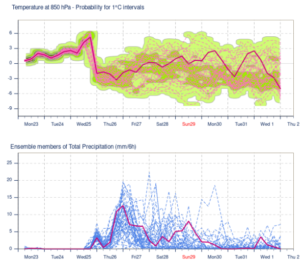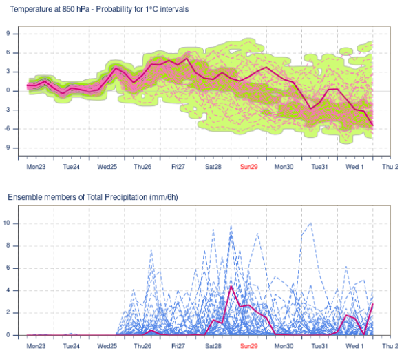 Obr. 7: Ansámblová predpoveď teploty v hladine 850 hPa a zrážok pre Stropkov od 23. marca do 1. apríla. Zdroj: ECMWF