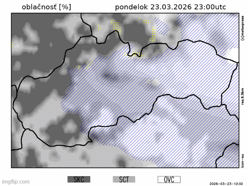 Obr. 2: Predpoveď oblačnosti podľa modelu ICON na utorok, 24. marca.