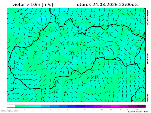 Obr. 4: Predpoveď smeru a priemernej rýchlosti vetra podľa modelu ICON na stredu, 25. marca.