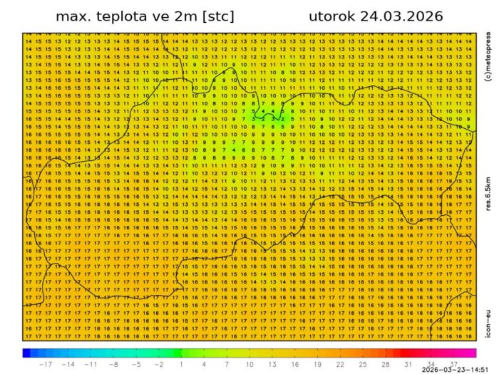 Obr. 3: Predpoveď maximálnej dennej teploty podľa modelu ICON na utorok, 24. marca.