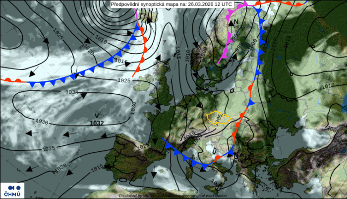 Obr. 4: Predpoveď synoptickej situácie na štvrtok, 26. marca. Zdroj: ČHMÚ