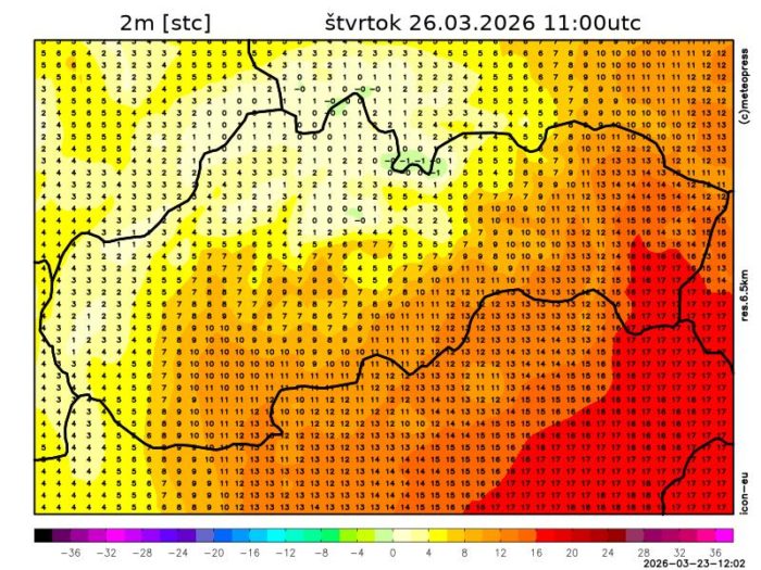 Obr. 6: Predpoveď teploty vzduchu v 2 m podľa modelu ICON na štvrtok o 12:00 hod.