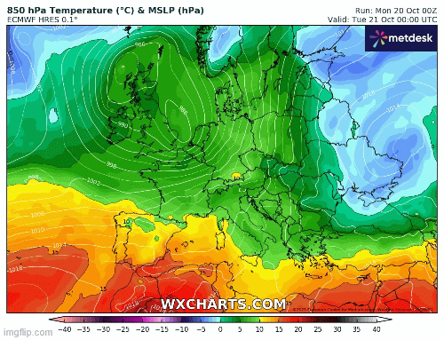 Prílev teplého vzduchu vo vyšších hladinách ovzdušia nad našu oblasť ešte nemusí znamenať teplé počasie na celom území a slnečnú oblohu. Podobný ráz počasia ako v utorok možno očakávať aj v stredu a vo štvrtok. Nočná teplota bude o čosi vyššia ako v priebehu predošlých nocí, čiže zväčša 10 až 5 °C, trochu chladnejšie môže byť v dolinách. Cez deň sa bude teplota pohybovať na úrovni 12 až 17 °C, pri dlhšie trvajúcej veľkej oblačnosti, hmiel a zrážkach len 7 až 12 °C. Prílev teplého vzduchu vyvrcholí vo štvrtok, kedy ojedinele teplota vystúpi do približne 20 °C, následne príde v piatok od západu studený front. Za ním sa ochladí na 12 až 17 °C, na severe bude miestami okolo 10 °C. Na fronte bude aj viac zrážok, predovšetkým v noci na piatok. Cez víked očakávame skôr prechod k premenlivej oblačnosti a ojedinelým prehánkam, vo vysokých polohách snehovým. Zmenu počasia v podobe ochladenia nám ilustruje predpoveď teploty v hladine 850 hPa (okolo 1500 m n. m.) nad Európou na obr. 7. Zo štvrtkových 10 °C sa ochladí na približne 0 °C.