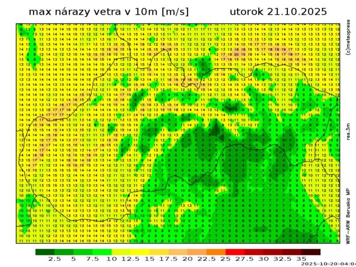 Obr. 4: Predpokladané maximálne nárazy vetra v utorok (21. 10.) podľa modelu WRF