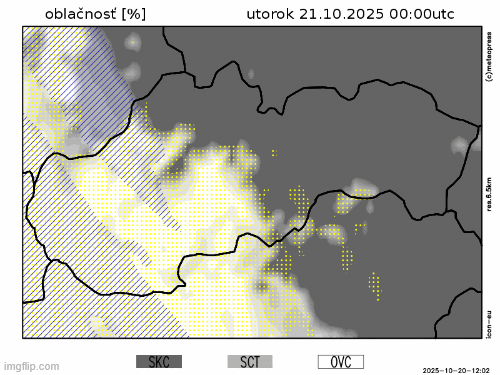 Obr. 2: Predpokladaný vývoj oblačnosti na Slovensku v utorok (21. 10.) podľa modelu ICON-EU