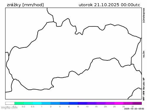 Obr. 3: Predpokladaný vývoj zrážok na Slovensku v utorok (21. 10.) podľa modelu WRF