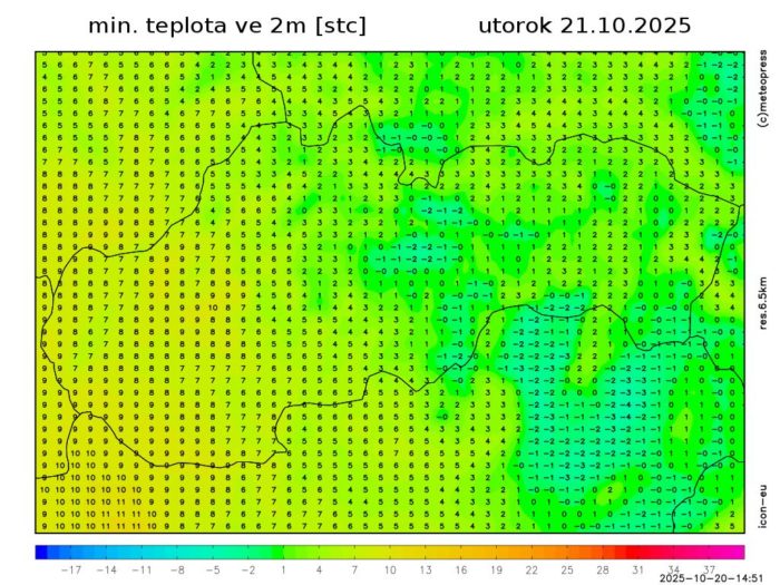 Obr. 5: Predpokladaná minimálna teplota vzduchu v utorok (21. 10.) podľa modelu ICON-EU