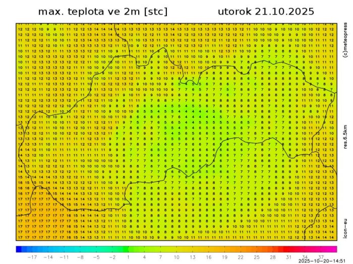 Obr. 6: Predpokladaná maximálna teplota vzduchu v utorok (21. 10.) podľa modelu ICON-EU