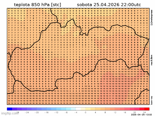 Obr. 4: Predpoveď teploty v hladine 850 hPa, resp. v nadmorskej výške okolo 1500 m n. m., podľa modelu ICON.