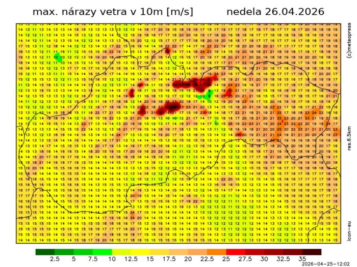 Obr. 7: Predpoveď maximálnych nárazov vetra v 10 m podľa modelu ICON.