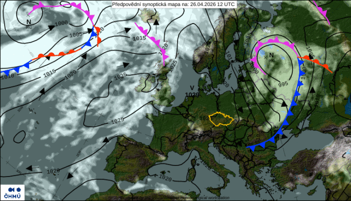 Obr. 1: Predpoveď synoptickej situácie na nedeľu, 26. apríla. Zdroj: ČHMÚ