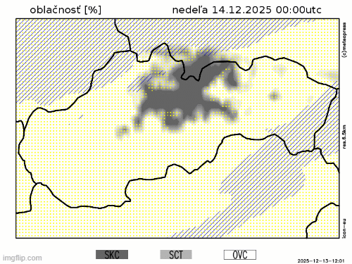Obr. 2: Predpokladaný vývoj oblačnosti na Slovensku v nedeľu (14. 12.) podľa modelu ICON-EU