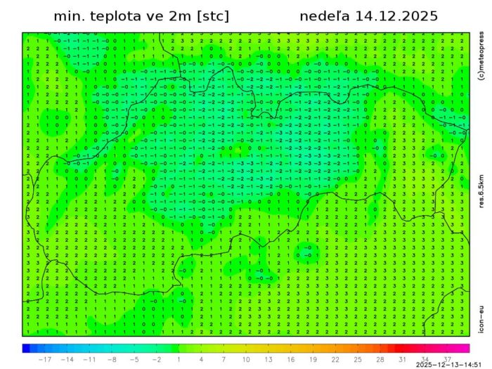 Obr. 4: Predpokladaná minimálna teplota vzduchu v nedeľu (14. 12.) podľa modelu ICON-EU