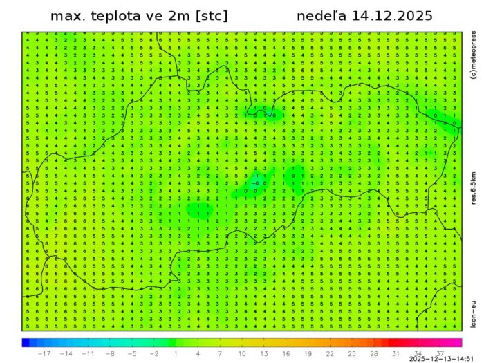 Obr. 5: Predpokladaná maximálna teplota vzduchu v nedeľu (14. 12.) podľa modelu ICON-EU