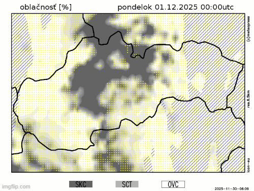 V noci aj cez deň zamračené a hmlisto, len ojedinele aj zmenšená oblačnosť. Ojedinele slabé zrážky.