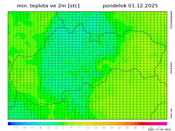 Obr. 3 Minimálna nočná teplota podľa modelu ICON-EU.