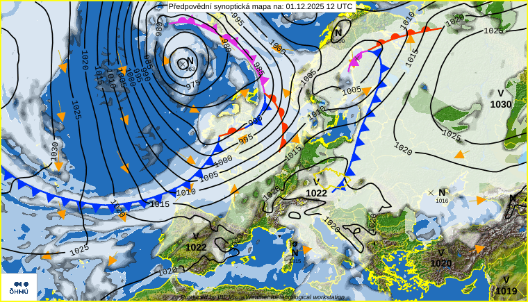 Obr. 1 Synoptická analýza na pondelok 1.12.2025. Zdroj: ČHMÚ.