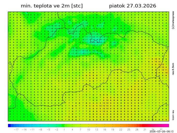 Obr. 2: Predpoveď minimálnej teploty v 2 m podľa modelu ICON.