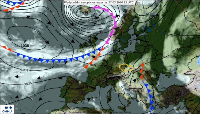Obr. 1: Predpoveď synoptickej situácie na piatok, 27. marca. Zdroj: ČHMÚ