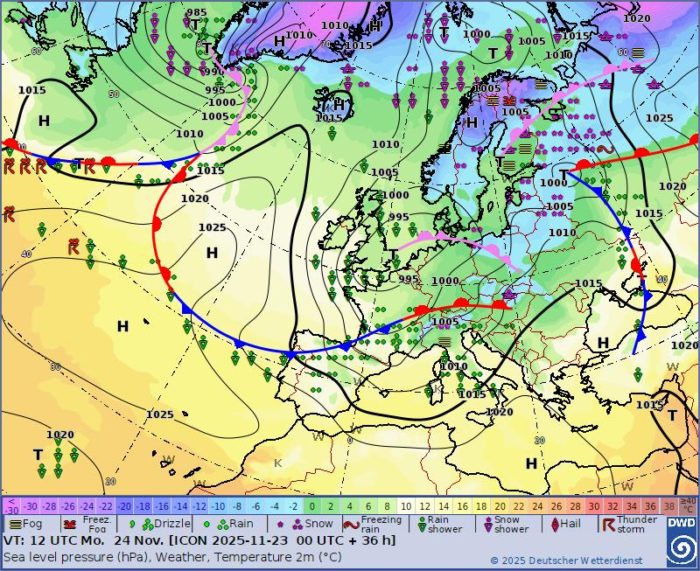 Obr.1: Synoptická situácia – pondelok (24. 11.)