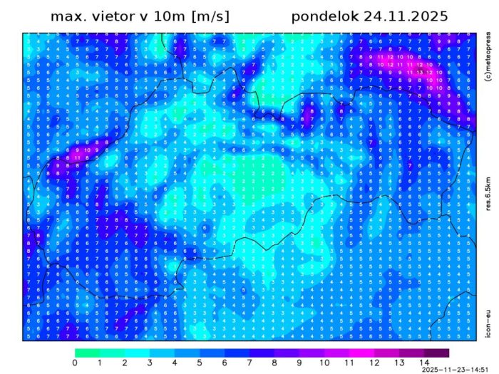 Obr. 5: Predpokladaná maximálna rýchlosť vetra na Slovensku v pondelok (24. 11.) podľa modelu ICON-EU