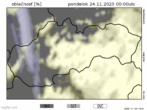 Obr. 2: Predpokladaný vývoj oblačnosti na Slovensku v pondelok (24. 11.) podľa modelu ICON-EU