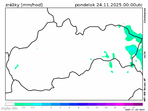 Obr. 3: Predpokladaný vývoj zrážok na Slovensku v pondelok (24. 11.) podľa modelu WRF