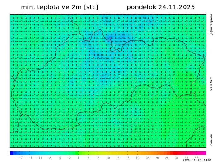 Obr. 6: Predpokladaná minimálna teplota vzduchu v pondelok (24. 11.) podľa modelu ICON-EU