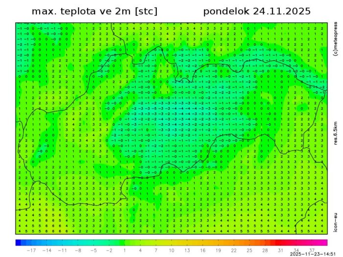 Obr. 7: Predpokladaná maximálna teplota vzduchu v pondelok (24. 11.) podľa modelu ICON-EU