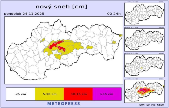 Obr. 4: Predpokladaná akumulácia snehu na Slovensku za celý pondelok (24. 11.) podľa modelu ICON-EU