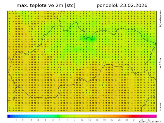 Obr. 3: Predpoveď maximálnej dennej teploty v 2 m podľa modelu ICON.