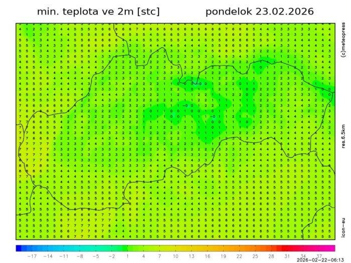 Obr. 2: Predpoveď minimálnej teploty v 2 m podľa modelu ICON.