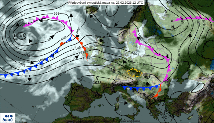 Obr. 1: Zdroj: Predpoveď synoptickej situácie na pondelok, 23. februára. Zdroj: ČHMÚ