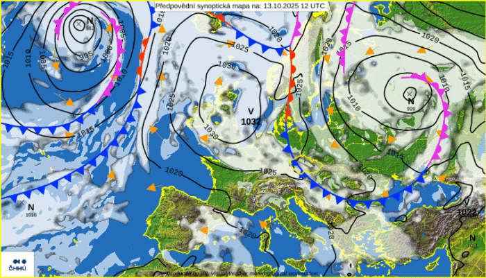 Obr. 1: Predpoveď synoptickej situácie na pondelok, 13. októbra. Zdroj: ČHMÚ