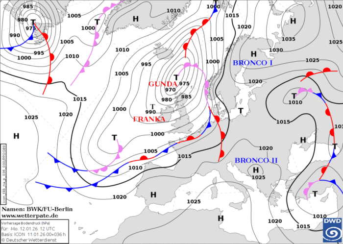 Obr. 1: Predpoveď synoptickej situácie na pondelok, 12. januára. Zdroj: DWD