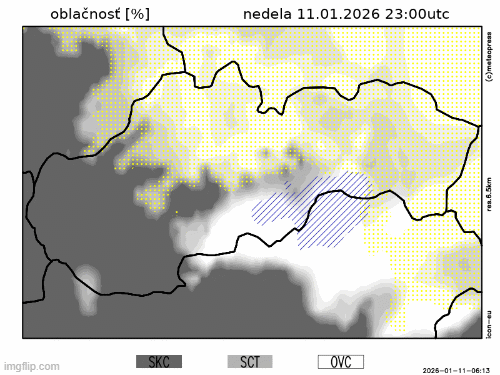 V noci a dopoludnia bude prevažovať veľká oblačnosť na severe a východe krajiny, na ostatnom území bude zväčša jasno až polojasno. Popoludní bude od západu oblačno až zamračené.