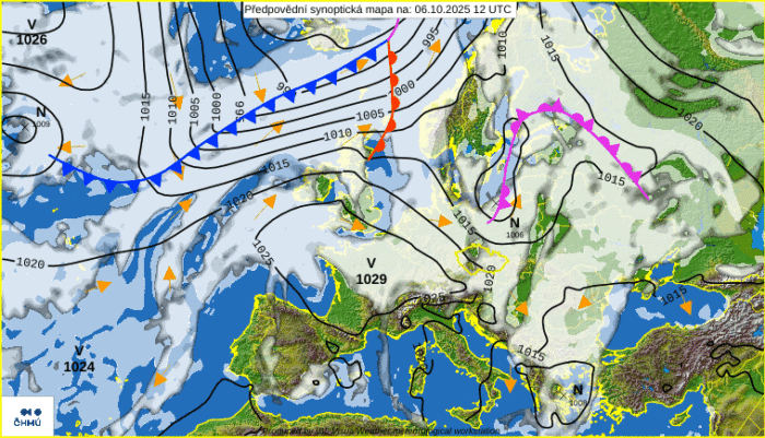 Obr. 1: Predpoveď synoptickej situácie na pondelok, 6. októbra. Zdroj: ČHMÚ