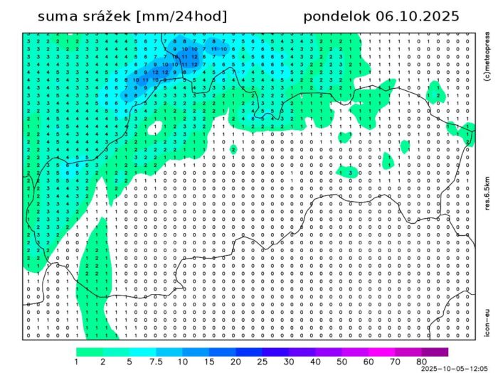 Obr. 3: Predpoveď akumulácie zrážok za 24 hodín (pondelok) podľa modelu ICON.