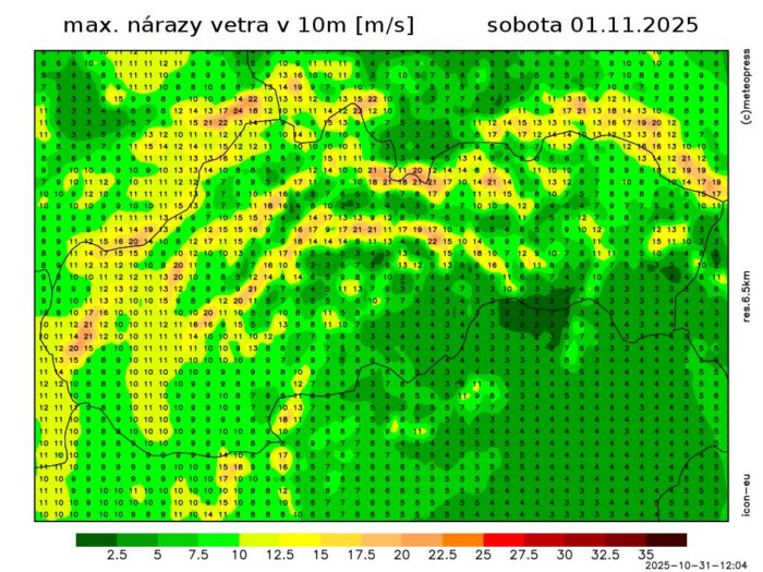 Obr. 5: Predpoveď maximálnych nárazov vetra podľa modelu ICON.