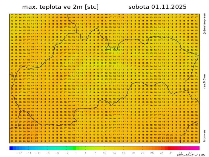 Obr. 3: Maximálna denná teplota podľa modelu ICON.