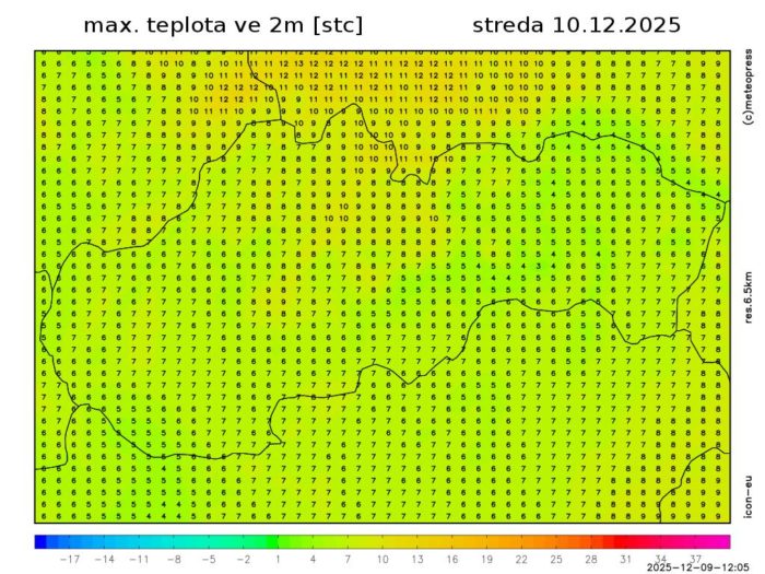Obr. 4: Predpokladané maximálne teploty vzduchu v stredu (10. 12.) podľa modelu ICON